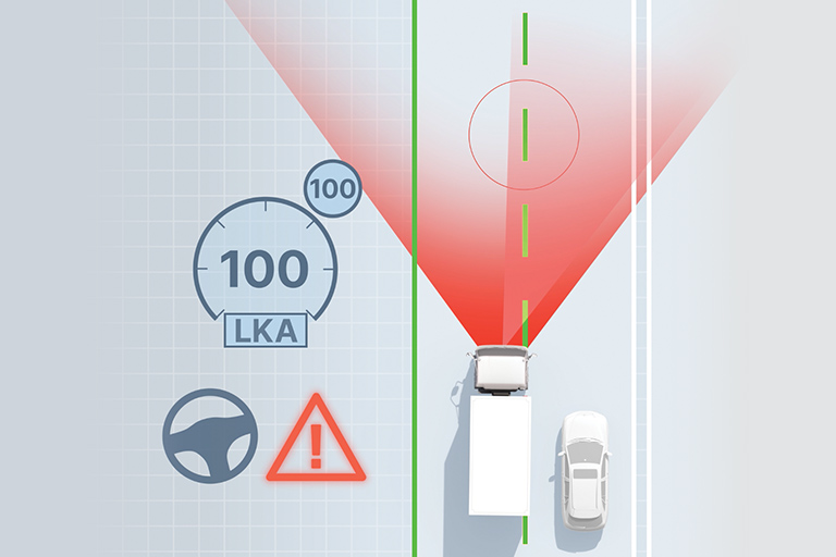 FCW scans the road ahead to detect vehicles, pedestrians, bicycles, or other obstacles. Using a stereo camera system enables the truck to judge distance and relative speed in a similar way to human eyesight. If it senses a potential collision, it provides a visual and audible warning to the driver.